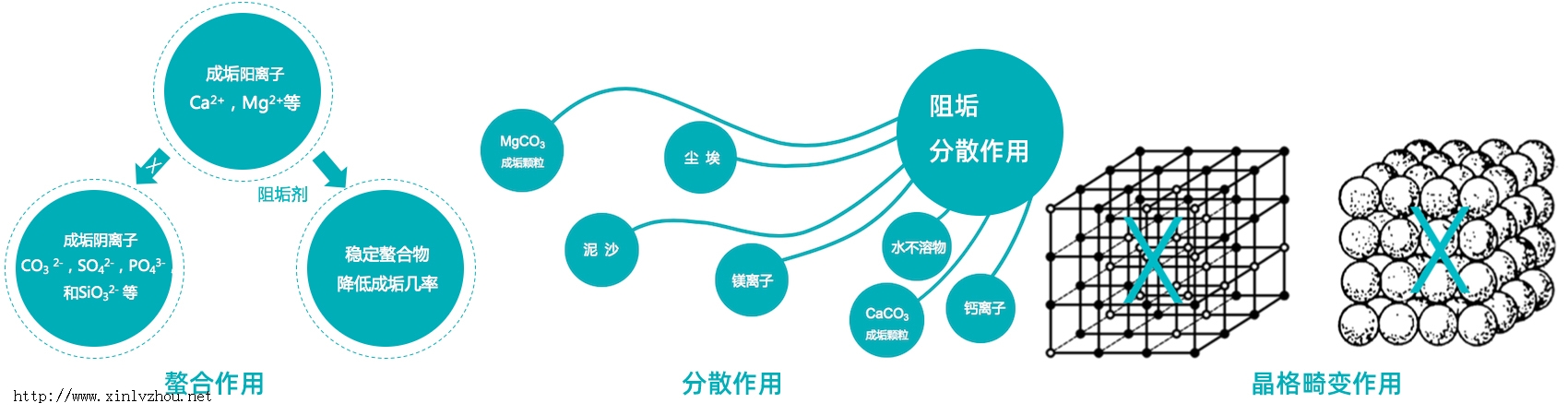 晶格畸變作用:通過提高結(jié)垢物質(zhì)微粒表面的電荷密度使微粒間排斥力增大,降低結(jié)晶速率,并使晶格結(jié)構(gòu)發(fā)生畸變,從而防止結(jié)成硬實(shí)的水垢。